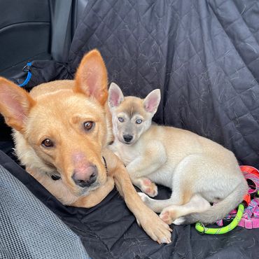 Arya is a 4-year-old mutt. Sometimes we call her a pit mix to illustrate how misleading and inaccurate it is to lump them together, but her breed composition (via Embark) is 59% Siberian Husky, 30% APBT (American Pit Bull Terrier), and 11% GSD (German Shepherd Dog). Arya was born in the passenger seat of a Ford Raptor in our driveway; we were heavily involved in a rescue at the time, her mom was minutes from euthanasia at DACC (Detroit Animal Care and Control) when she was picked up, and the foster stopped at our house for supplies when she noticed puppies started popping out. Six weeks later, at an adoption event, we saw potential adopters holding her, and we looked at each other because we both knew we would end up adopting her. So now we have this dog who looks like a coyote but acts almost 100% like a husky (talking, using her paws, opening doors, etc.), and she loves other dogs so much that she completely ignores other dogs' "corrections" and turns the other way.